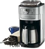 Cuisinart Grind and Brew 12 Cup Thermal Carafe Automatic Coffeemaker (Brushed Chrome). 12-cup capacity. 24-hour fully programmable. Built-in burr grinder automatically grinds beans before brewing. Double-wall insulated thermal carafe. Strength selector and grind control fine-tune intensity and volume. 8-ounce bean hopper. Auto shutoff when brewing is complete. Charcoal water filter. Brew-pause function. Gold tone commercial-style permanent filter and measuring scoop. 2 to 4 cup feature